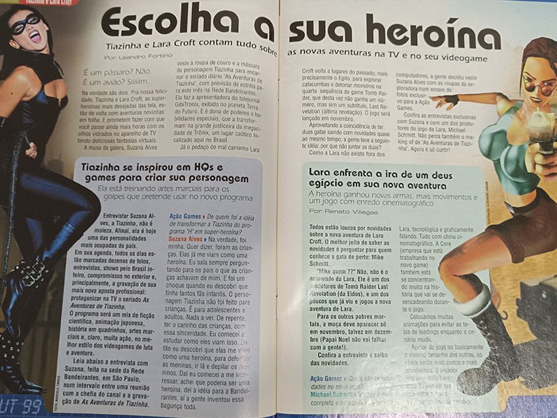 A edição de outubro de 1999 da Ação Games marcou época. A capa mostrava Tiazinha e Lara Croft juntas, simbolizando o encontro entre dois fenômenos culturais: o sucesso televisivo da personagem criada por Suzana Alves e a força de Tomb Raider, que dominava o mundo dos games.